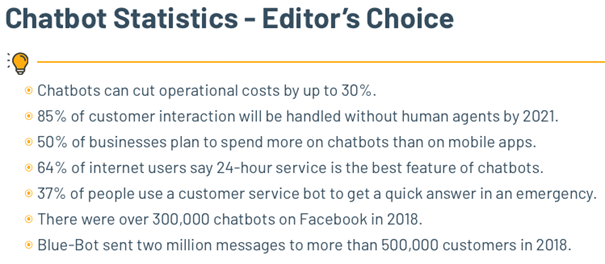 Įmonės vis dažniau naudoja pokalbių robotus ir virtualius asistentus internete, kad pagerintų klientų aptarnavimą, sumažintų išlaidas ir pagreitintų atsakymo laiką. Apskaičiuota, kad pokalbių robotais (iššokančiais pranešimų langais) naudojasi 1,4 mlrd. žmonių ir kad jie gali atsakyti į 80 proc. standartinių klausimų.