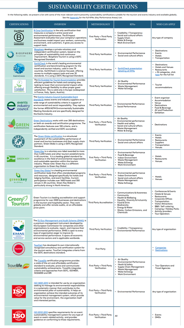 Vedno več je strank, ki zahtevajo certificiranje kot del svojega trajnostnega programa. Svet za trajnostni turizem (Global Sustainable Tourism Council - GSTC) si prizadeva akreditirati vodilne programe certificiranja trajnostnega turizma in zagotoviti, da izpolnjujejo minimalne standarde. GSTC neposredno ne certificira nobenih proizvodov ali storitev, vendar akreditira tiste, ki to počnejo, v skladu s svojimi strogimi in obsežnimi merili. GSTC si prizadeva upoštevati kodekse dobre prakse zavezništva ISEAL, ki zagotavlja smernice za organizacije za certificiranje in akreditacijo trajnostnega turizma v vseh sektorjih. Certifikat, ki ga je akreditiral GSTC, je torej zagotovilo kakovosti na področju trajnostnega certificiranja.